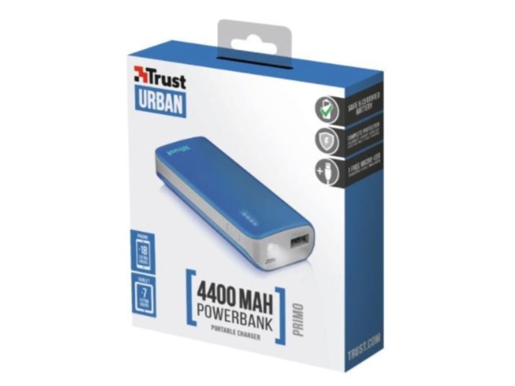 Užijte si kompaktní rozměry, nízkou hmotnost a inteligentní ochranný systém pro bezpečné a rychlé nabíjení. Trust Primo je stylovým a praktickým řešením jak udržet vaši elektroniku v pohotovosti. Powerbanka TRUST není nikterak těžká ani velká, ale i přes to dokáže pojmout až 4 400 mAh elektrické energie. Je vybavena 1x port USB s napájením 5 W/1 A. Powerbanka navíc rozpozná zařízení a nastaví nejvyšší možnou rychlost dobíjení.